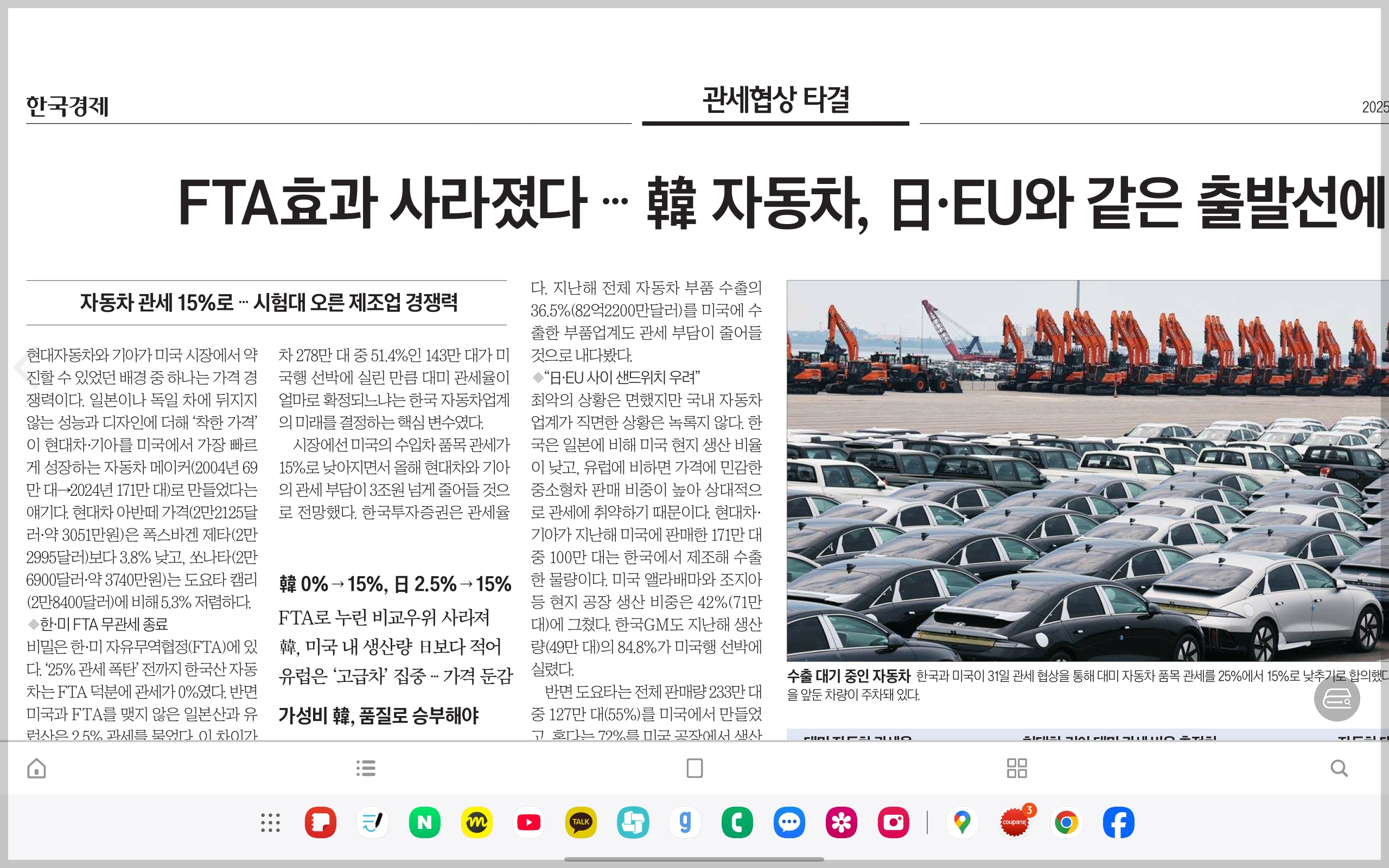 '작은 경제, 큰 이야기'에서 11번째로 함께 볼 기사는 한국경제신문 2025년 8월 1일자에 실린 "FTA효과 사라졌다...韓 자동차, 日·EU와 같은 출발선에"입니다.