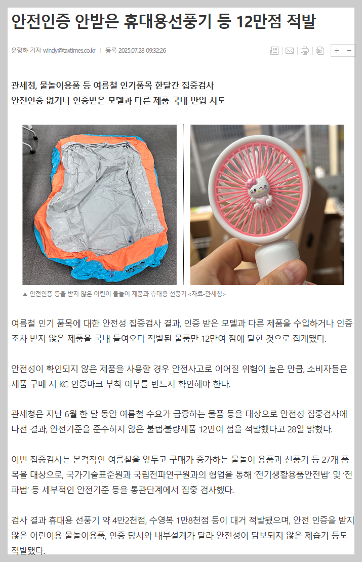 특히 휴대용 선풍기, 물놀이 완구 등은 매년 반복적으로 적발되는 품목이니, 관련 업계 종사자분들은 반드시 체크하셔야겠습니다.